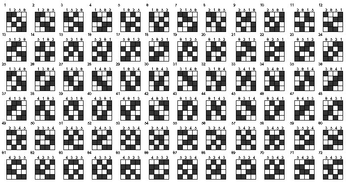 | 今、図1の結合状態の中より、「対称」「反転」の視点から、図3のようなお互いに補完関係にあるペアーで構成される結合状態を選択すると、図4の72通り(=3*4*3*2)の結合状態がある事が判ります。 |