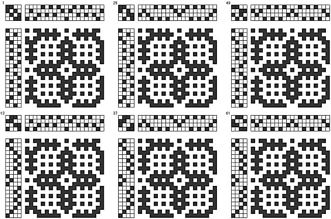 | この72通りの結合状態は、最初にお話した2つの原則から、お互いにどのパターンへも変換が可能です。 図4の「1」の結合状態を最左列の「13,25,37,49,61」の結合状態に変換したものが図5です。 |