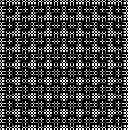 | 八つ縄文織りの最大の特性は「柄の拡大・縮小を経・緯両方向共自由に行える」ことにあります。 また従来より4枚綜絖、4本踏み木(「4×4」)で製織していたものを4枚綜絖、6本踏み木(「4×6」)とし、タビー(平織り)を入れることにより柄を経方向に拡大する技法は「4×6」の特徴的な重要技法とされ多くの教本にも記載されてきました。(図1,2,3-2参照) しかし経、緯両方向共に柄を拡大する技法は見聞した経験を持ちません。今回「6×6」を使用して柄を経、緯両方向とも拡大する技法が完成しましたので「正方形、菱形、円」の分類で作品と組織図を随時掲載して行く事といたしました。(「組織図」をクリックすると別ウインドで組織図がPDFで開きます) なお八つ縄文織りの最大の特性「柄の拡大・縮小」を「6×6」で織り出すこの技法を「八つ縄文織り6×6」と呼ぶ事と致しますが、従来の「八つ縄文織り(4×4)」と「八つ縄文織り6×6」では柄を織り出す方法が全く異なる事、及び織り上がりの質感も大きく異なる事を申し添えます。 【表記法について】 4枚綜絖4本踏み木=「4×4」 4枚綜絖、6本踏み木=「4×6」 6枚綜絖、6本踏み木=「6×6」 |
