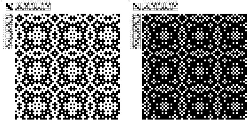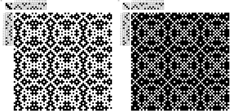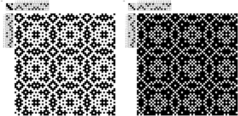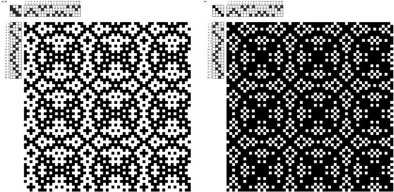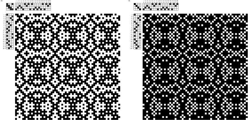 「綜絖通し」は同一で「踏み木の踏み順」が異なります。言い換えれば列(縦)方向の8つの組織は「踏み順」を変えるだけで織り出すことができ、8タイプを同一の織りの中で製織することができます。また左右の組織は「結合状態」のみ異なっています。これも言い換えれば左右の組織は「結合状態」」を変えるだけで織り出すことができることを示しています。またこの16パターンを使用することにより非常に有用な柄を織り出すことができることはしばしば経験してきました。