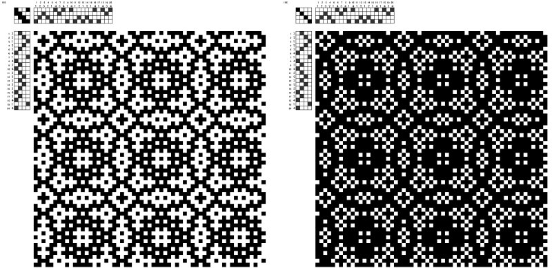 下の16枚の組織図を御覧ください。布の組織は全て異なっています。しかし列(縦)方向では8枚の組織の「結合状態」と