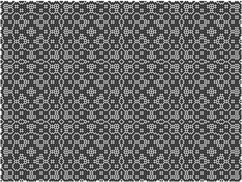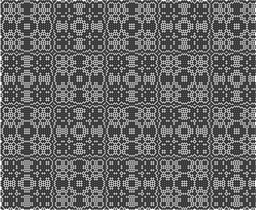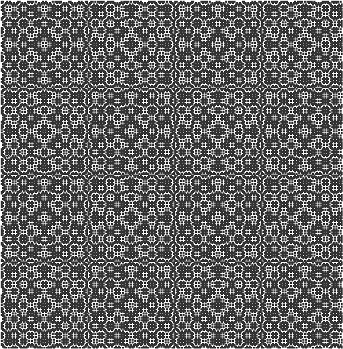 円の特性をもった柄(図1~図3)の数列と四角形の特性を持った数列を「合成」することにより図4から図6のように四角形と円の特性とが共存した柄を織り出すことができます。また四角形に内接した円は想像を超えた新たな柄を創り出します。(図4を様々な角度からご覧になって下さい。)