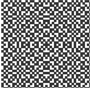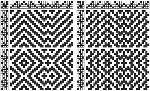 図1をもとに「結合状態」、「踏み木の踏み順」を変えずに「あすび通し」だけ変更したものが図2、3、4です。ご覧いただくとお判りのように図2,3は柄となっていますが、図4は柄と云える状態にはありません。限りなく変更が可能であってもすべてが柄として有意ではありません。(ここでは無視されている色など様々な要因が加わることにより、図4も蘇ることがあるかもしれませんが)変な言い方かもしれませんが無意味なあすび通しは無意味です。