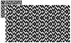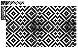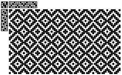 模様が柄(有意な模様)として私たちに何かを感じさせる時、その模様の全体像は規則性(対称・反復・反転等)を持つ部分によって作り出されている事が殆どです。(蛇足ですが、逆に決して規則性のない組織を描いたものが「コラム 織りの豆知識 柄を作る 番外編」に載せた組織図です。)しかも部分を見ただけでは到底想像もつかない世界が全体を見渡した時現れています。図5を織ると図6のような全体像になることを連想する事は極めて困難です。