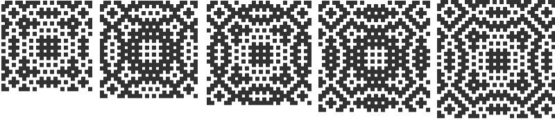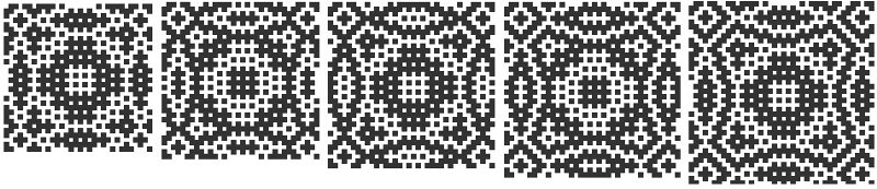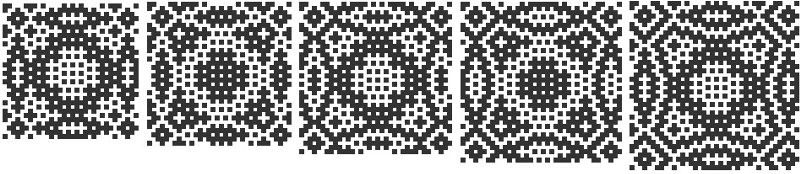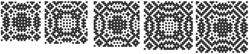 この数列の持つ特性を保持して柄を成長させると、柄の特性も保持されて行きます。 図2から図5は図1の組織をベースに柄を成長させ、「円」を織り出しています。