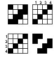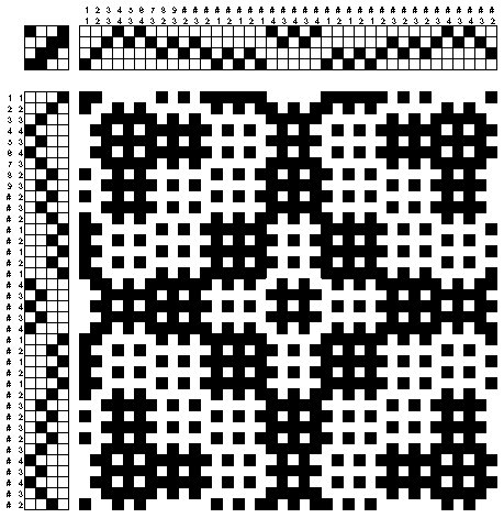 4枚綜絖4本踏み木の組織(図1)の完全組織(図1の組織を構成する行列方向の最小単位)は次の3つの条件下では図2のように書き表せます。