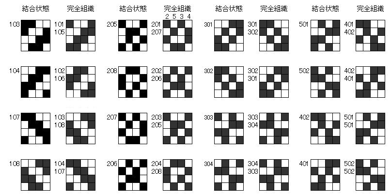 「結合状態変更による柄の変化」のところでもふれましたが「結合状態」と「完全組織」とは「1対1」で対応しています。上記の条件下では「完全組織」と「結合状態」の対応は一部ですが図3のように書くことができます。