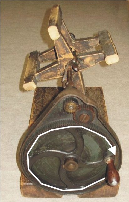 1.座繰り機の持ち手1回転で枠に巻き取れる糸長を予め測っておきます。(下図)