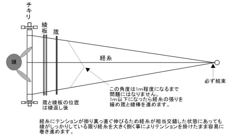 チキリ(or 箱)に巻く時チキリ(or 箱)を織り機に載せた状態で行なうより床巻きを行ったほうが何かと好都合です。特にやたら縞のような複雑な縞割を行い経糸が交錯した状態にある時は床巻きが大きな力を発揮します。(図-1参照)