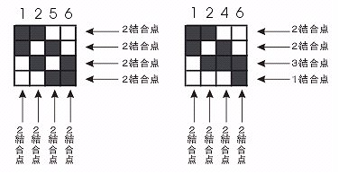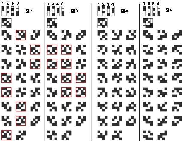 「結合状態を含めてあすび通しを変更しても柄は変わらない」の原則から、図2、3を行方向に並び替えて見ると(図2、3の下図を参照)、2本ロクロでも織れる結合状態がある事が判ります。(赤で囲まれた結合にすれば2本ロクロで織ることが可能です)また「結合状態を含め、踏み木の踏み順を変更しても柄は変わらない」の原則から、「1・2・5・6」を列方向に組合せた結合状態すべてが同一の意味を持ち、変更可能な結合状態を持っています。「1・3・4・6」「2・3・4・5」もまったく同様です。