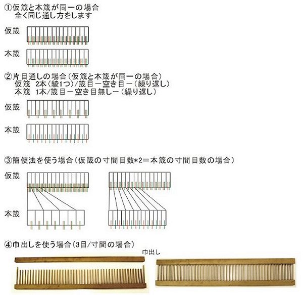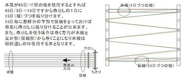 「仮筬」について 巾出しには通常その織りに使用する本筬を仮筬として使用するのが無難です。ちきりに巻く時経糸が交錯せず巻ける自信が付いてきたら簡易法を取ることが良いかと思います。巻く時経糸が交錯し仮筬が動かなくなってしまうと手の施しようがありません。