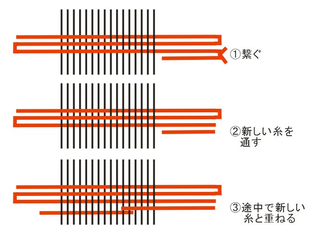 製織中の緯糸の繋ぎ方は下の通りです。それぞれの注意点は以下の通りです。