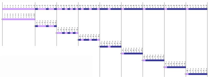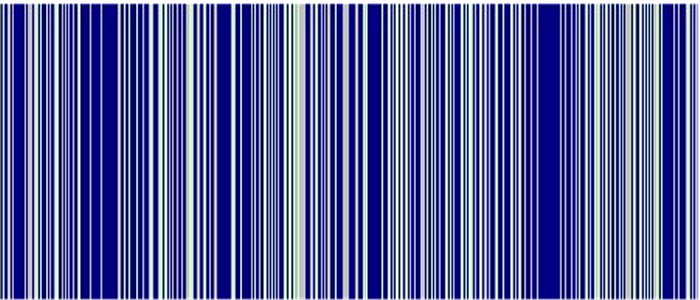 縞は大きく下記の二種類に分類出来ます。大きな縞は配色列順に整経出来ますが細かく複雑な縞は難しいものがあります。枠数に制限のある手織りの世界でも「縞割り」を行うことにより細かく複雑な縞も整経する事ができます。また「縞割り」をすると「綾」の持つ、糸をコントロールする底力を見せつけられます。ここでは図1を例に「縞割り」の手順を説明します。