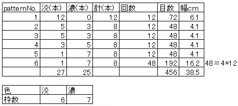 ②図4の配色列表から整経に必要な枠数を決定します。 図1は図3を9回繰り返していますが、巾を並幅とするためここでは12回繰り返す事とします。