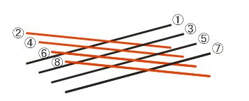 8枠立てて総切り替え(黒-赤-黒-赤と1本おき交互に色の変わる整経方法)で整経を始めたとします。整経台を1往復すると、綾は8目出来ることになります。必要綾数が8の整数倍の時は問題ありませんが8の整数倍+奇数目必要な場合は注意が必要です。