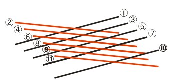 図1のように枠が右から「赤-黒-赤-黒-・・・」と立っている場合は、綾の最後の並びは図2のようになり(図2の下が整経台に向って手前になります)最後は「赤」で終わっています。