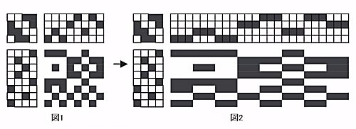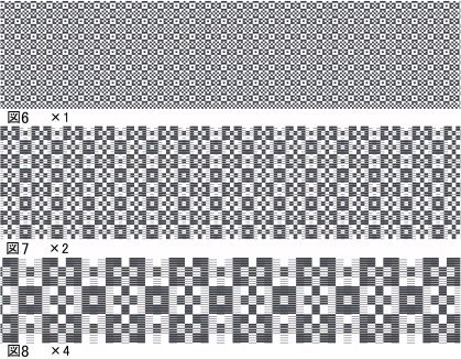 下の図6から図8は、平織りの混織とあすび通しの繰り返しにより図1の柄を拡大したものです。