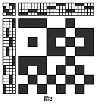 | 必要な巾分、あすびを通す回数を増やせば良い事がわかります。 これとは反対に、緯方向はそうは行きません。3倍にしたいといって、足を踏み換えずに3回緯糸を通しても、また緯糸を3倍太いものを使っても鮮明な柄を織りだす事は難しいものがあります。 こんな時使われるのが、「平織り」との混織です。図3のように続けて同じ踏み木を踏むことはできませんが、間に「平織り」を入れると、経、緯糸は押さえられ、「平織り」をはさんで連続して同じ踏み木を踏む事が可能となります。 |