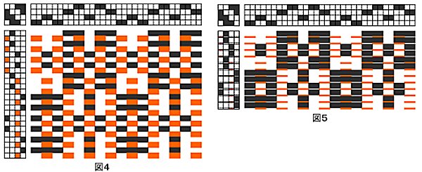 | 「平織り(赤い部分)」をいれたものが図4です。この時、「平織り」をする時の緯糸に見えないよう細い糸を使用すると、図5のようになり、図3の状態に近くなり、図2が緯方向にも拡大されたことが判ります。 |
