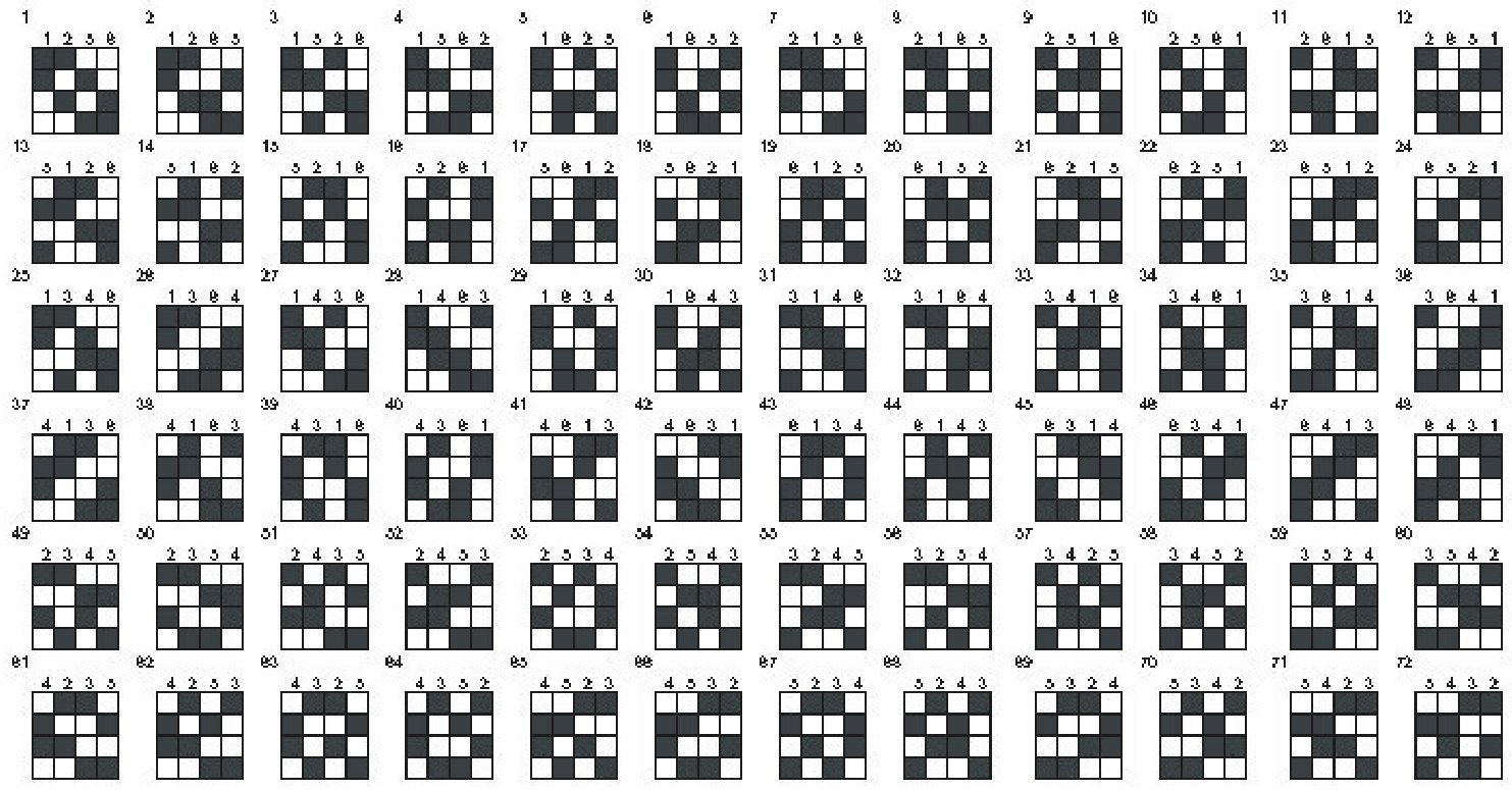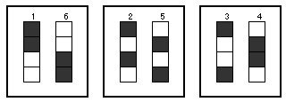 6本踏み木、4枚綜絖を使ってタビー(平織り)を入れ緯方向に拡大する手法(over shot)は従来多々使われてきました。また経方向も同様な考え方で拡大する手法も見られました。しかし4本踏み木、4枚綜絖で織られてきた織りの組織を経、緯方向とも自由に拡大可能の4本踏み木、4枚綜絖の組織に変換する系統的方法論は寡聞にして知りません。 八つ縄文織りは4本踏み木、4枚綜絖を使用し下記の条件を満たす組織であればすべての織りの組織を経、緯方向とも踏み木1回、綜絖通し1回毎整数倍に拡大する事が出来る手法です。 (注)倍率は「基本目数」に対し決められますから経糸の太さ、使用筬の密度を変え「基本目数」を変更すれば整数倍以外の倍率も製織可能です。 【八つ縄文織りの出来る組織の条件】 4本踏み木、4枚綜絖で織られた織りの組織の結合状態がすべて「2枚の綜絖枠」が「1本の踏み木」と結合された状態は図3の6種類があります。更にこの6種を互いに補完状態(白黒が反転した状態)にあるものを組み合わせたものは図4の3種類(1_6、2_5、3_4)があります。八つ縄文織りに変換できる組織の結合状態はこの3種から2種を組み合わせた縦横16(=4*4))マスから構成されていなくてはなりません。この図4から構成される結合状態は図5の72種類があり、この72種に含まれるすべての組織は八つ縄文織りで製織可能です。またこの条件はオーバーショット(OS)でも共通です。 |