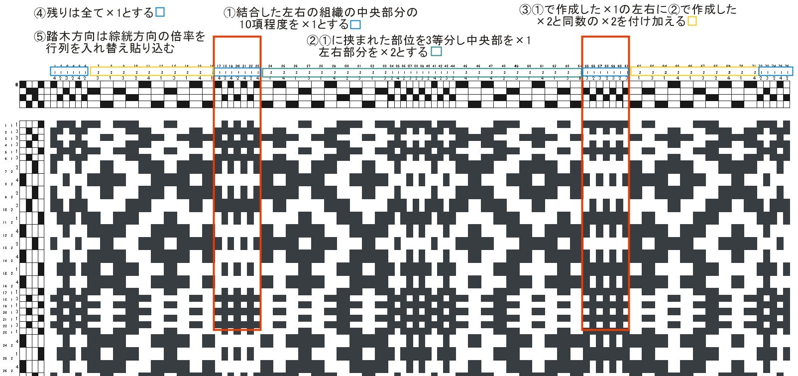 | ① 「八つ縄文織りのバリエーションの作成」で作成した組織図を八つ縄文織り組織図に変換します |